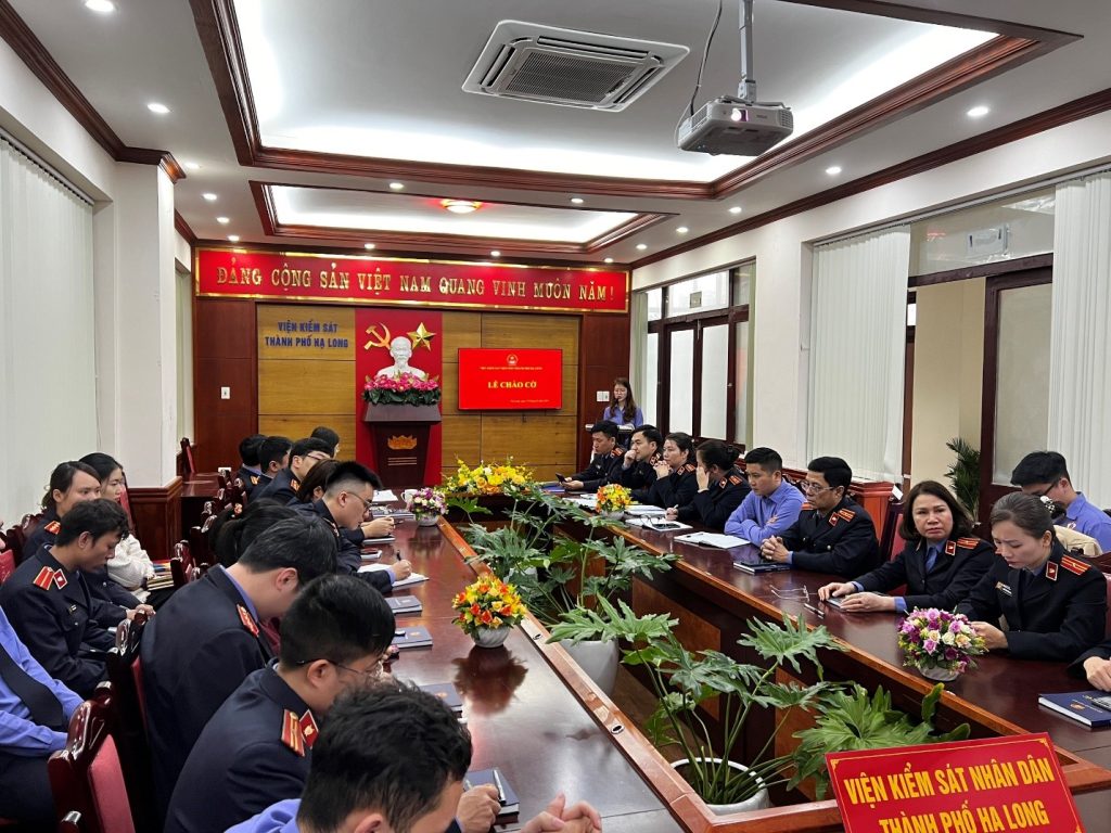Quang cảnh buổi Lễ Ngày 19/02/2024, Viện kiểm sát nhân dân thành phố Hạ Long tiếp tục thực hiện hiệu quả công tác Sinh hoạt chính trị thường kỳ duới hình thức tổ chức Lễ chào cờ đầu tuần và trình bày câu chuyện Học tập và làm theo tư tưởng, đạo đức, phong cách…