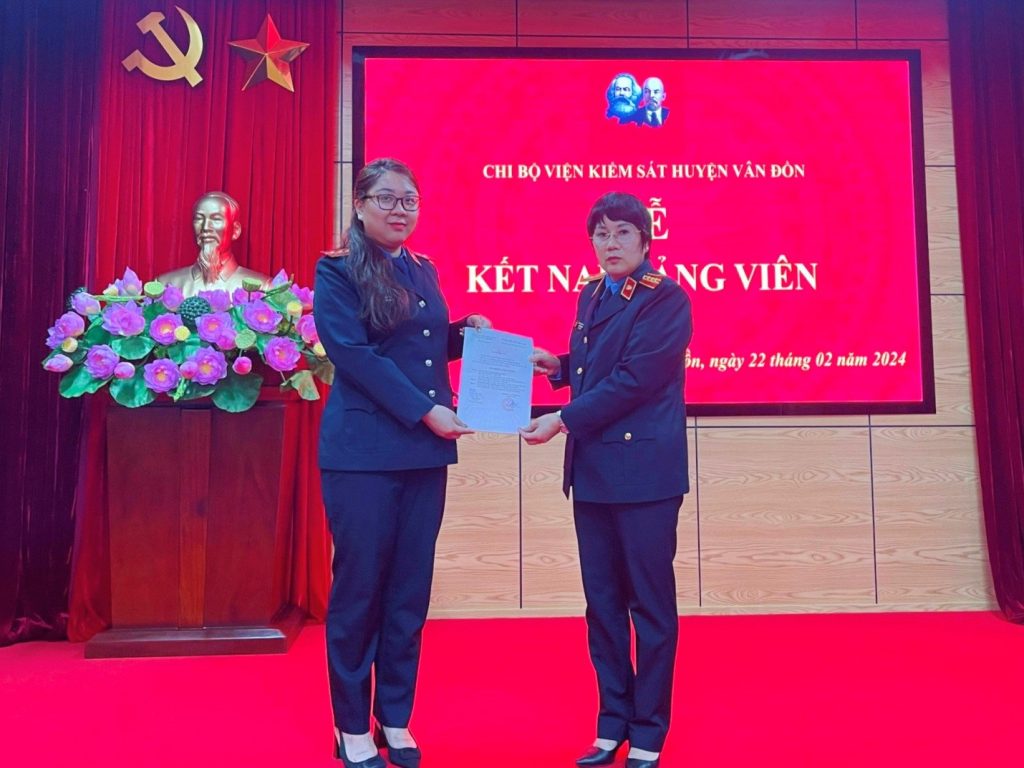 Ngày 22 tháng 02 năm 2024, Chi bộ VKSND huyện Vân Đồn đã long trọng tổ chức Lễ kết nạp đảng viên mới đối với quần chúng ưu tú Hoàng Mỹ Hạnh. Dự và chỉ đạo buổi Lễ có đồng chí Đỗ Thị Dung – Huyện uỷ viên, Bí thư Chi bộ, Viện trưởng Viện…