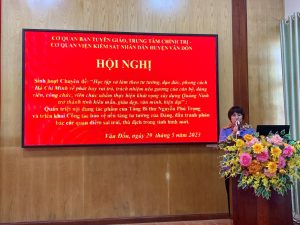 Tại Hội nghị các đồng chí Cấp uỷ viên và cán bộ, đảng viên trong Chi bộ Viện kiểm sát Vân Đồn đã được nghe đồng chí Châu Quốc Tuấn-Trưởng Ban Tuyên giáo Huyện uỷ Vân Đồn truyền đạt nội dung học tập Bác với chủ đề về “Phát huy vai trò, trách nhiệm nêu gương của cán bộ, đảng viên, công chức, viên chức nhằm thực hiện khát vọng xây dựng tỉnh Quảng Ninh trở thành tỉnh kiểu mẫu giàu đẹp, văn minh, hiện đại” và quán triệt nội dung cuốn sách của Tổng Bí thư Nguyễn Phú Trọng về “Kiên quyết, kiên trì đấu tranh phòng, chống tham nhũng, tiêu cực, góp phần xây dựng Đảng và Nhà nước ta ngày càng trong sạch, vững mạnh”; Chuyên đề về “công tác bảo vệ nền tảng tư tưởng của Đảng, đấu tranh phản bác các quan điểm sai trái, thù địch trong tình hình mới”.