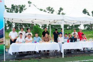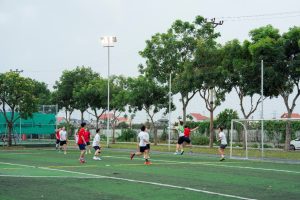 Trong không khí phấn khởi, náo nhiệt, các vận động viên và người tham dự đều thể hiện rõ tinh thần thể thao, đoàn kết và fair-play. Trận đấu bóng đá diễn ra trong không khí thân thiện, sôi nổi, thể hiện sự nhiệt huyết, năng lượng và quyết tâm của mỗi đội để chiến thắng.