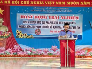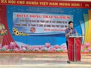 Tiếp theo, các đoàn viên của Chi đoàn Viện kiểm sát nhân dân thị xã Đông Triều thông tin cho các thầy cô cùng các em học sinh những nội dung thiết thực về thực trạng, tác hại và những phương thức xâm nhập vào học đường của ma tuý, các chất kích thích, hướng thần khác. Đồng thời tuyên truyền các quy định của pháp luật đối với tội phạm về ma tuý nói chung, tội tổ chức sử dụng trái phép chất ma tuý nói riêng, nhằm giáo dục đến các em học sinh kỹ năng phòng, chống loại tệ nạn này. Bằng kiến thức pháp luật và kinh nghiệm chuyên môn, Chi đoàn Viện KSND thị xã Đông Triều đã xây dựng bố cục bài tuyên truyền từ quy định của pháp luật tới tình huống thực tế để minh hoạ, qua đó đã truyền tải đến mỗi em học sinh nâng cao hơn nữa ý thức về việc chấp hành pháp luật và rút ra được những điều cần làm đối với bản thân, cũng như khuyên nhủ bạn bè những việc không nên làm.
