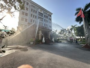 Cùng với đó, Phòng Cảnh sát PCCC Công an tỉnh Quảng Ninh cũng đã điều 02 xe chữa cháy, 01 xe thang, 01 xe cứu nạn cứu hộ, 01 xe bơm chuyên dụng cùng các chiến sĩ cảnh sát PCCC phối hợp với lực lượng chữa cháy ở cơ sở triển khai đội hình, nhanh chóng dùng vòi phun nước dập lửa và giải cứu những người bị kẹt trong tòa nhà. Sau gần 20 phút đám cháy giả định đã được khống chế và dập tắt hoàn toàn, toàn bộ người bị nạn đã được giải cứu.