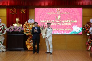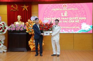 Đ/c Nguyễn Duy Giảng, Phó Viện trưởng VKSND tối cao trao Quyết định bổ nhiệm và tặng hoa chúc mừng đ/c Vũ Đức Ninh
