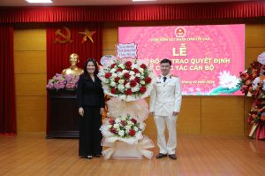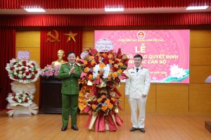 Đồng chí Lê Hồng Vân- Phó Giám đốc Công an tỉnh Quảng Ninh tặng hoa chúc mừng đồng chí Vũ Đức Ninh