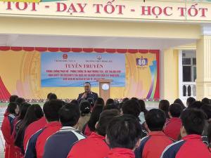 Tiếp nối chương trình, đơn vị đã tập trung tuyên truyền về công tác phòng chống pháo nổ và đốt thả đèn trời – những hành vi thường có xu hướng gia tăng trong dịp Tết. Báo cáo viên đã khái quát thực trạng vi phạm hiện nay, đặc biệt là tình trạng học sinh tham gia chế tạo, tàng trữ và mua bán pháo nổ trái phép qua mạng xã hội. Các quy định tại Nghị định số 137/2020/NĐ-CP và Nghị định 282/2025/NĐ-CP về xử phạt vi phạm hành chính trong lĩnh vực an ninh trật tự đã được phổ biến sâu rộng. Báo cáo viên nhấn mạnh những tác hại khôn lường của đèn trời như nguy cơ cháy nổ, đe dọa an toàn hàng không và ô nhiễm môi trường. Về mặt hình sự, theo Bộ luật Hình sự 2015 (sửa đổi, bổ sung 2025), các cá nhân có hành vi vi phạm về pháo hoặc đốt thả đèn trời gây hậu quả nghiêm trọng như cháy nhà, chết người hoặc thiệt hại lớn về tài sản có thể bị truy cứu trách nhiệm hình sự. Thông điệp “Vui xuân – đón Tết an toàn – không đốt pháo nổ. Tuân thủ pháp luật là bảo vệ chính mình và cộng đồng” đã được các em học sinh đồng thanh hưởng ứng mạnh mẽ.