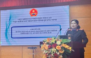 Tiếp đó, đồng chí Lam Thị Dung – Phó trưởng Phòng 9 giới thiệu những nội dung cơ bản của Hướng dẫn số 42 ngày 28/11/2025 của VKSND tối cao về quy trình khởi kiện vụ án dân sự công ích. Quy trình gồm 04 giai đoạn là: Tiếp nhận, xử lý, xác minh thông tin, thụ lý vụ việc dân sự công ích; xác minh, thu thập tài liệu, chứng cứ; nghiên cứu hồ sơ; thông báo khởi kiện, kiến nghị khởi kiện, hỗ trợ khởi kiện; khởi kiện vụ án dân sự công ích.